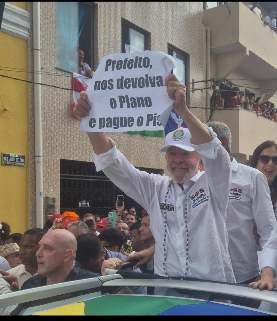 Ainda no tradicional cortejo do Dois de Julho, em Salvador, o presidente Luiz Inácio Lula da Silva (PT) protagonizou um gesto político que repercutiu no cenário local nesta quarta-feira (02), o presidente levantou uma placa em referência aos professores da rede municipal em greve com os dizeres: “Prefeito, nos devolva o plano e pague o piso”.