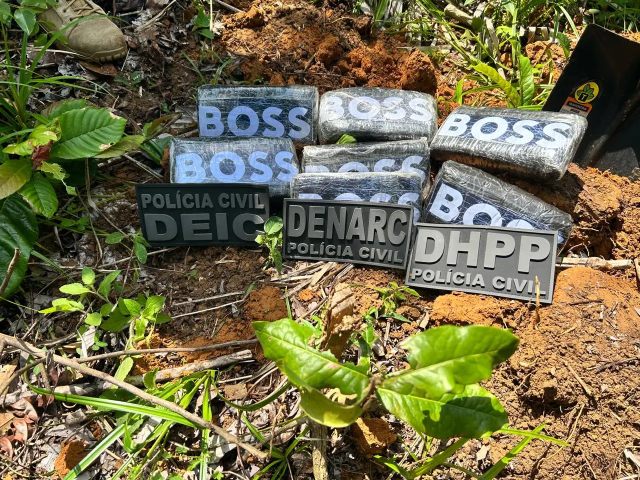 Durante a operação, que contou com equipes do DEIC, DHPP e DENARC, os policiais encontraram sete tabletes de cocaína enterrados no terreno, confirmando que o espaço servia como depósito estratégico da facção.