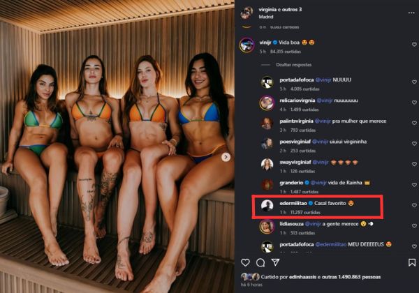 Nos comentários da publicação, em que Virginia e Tainá aparecem ao lado de duas amigas curtindo um dia de sauna e piscina, Vini comentou: “Vida boa”. Em resposta ao colega de Seleção Brasileira, Militão disparou: “Casal favorito”.