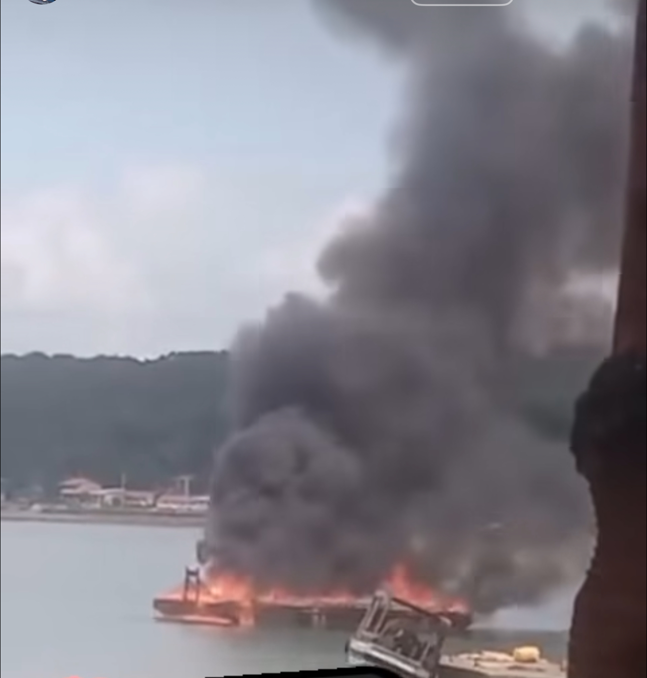 Imagens feitas por funcionários da instituição mostram muita fumaça preta e a embarcação em chamas. Agentes trabalham para apagar o fogo.