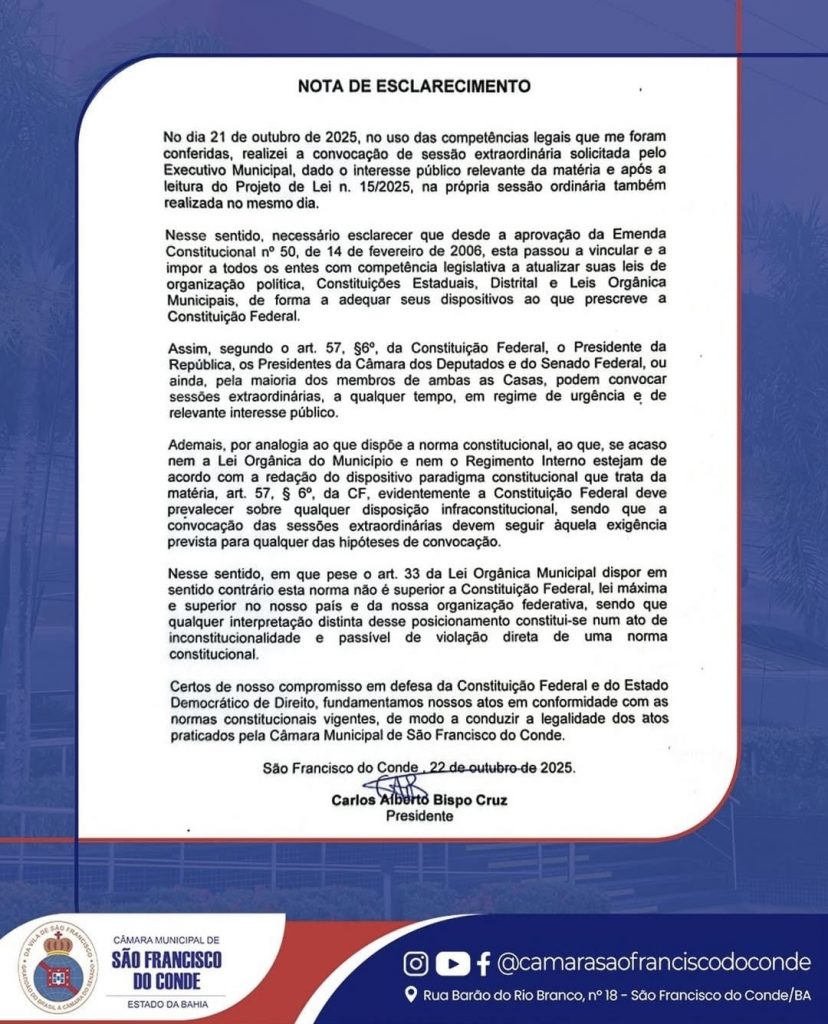 Na nota, Nem afirma que a sessão foi convocada a pedido do Executivo Municipal. No entanto, em nenhum trecho do documento oficial essa informação aparece. Na prática, o presidente se desmente: primeiro afirma que a convocação partiu dele; depois, diz que foi a pedido do Executivo.