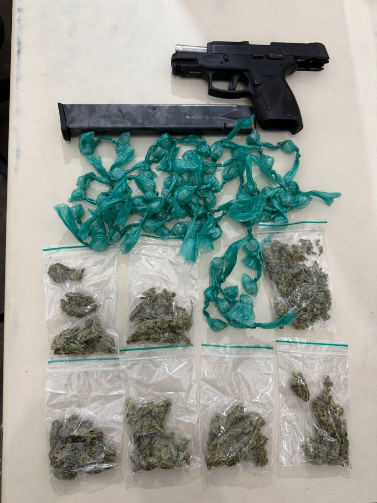 Com o indivíduo, foram apreendidos drogas e uma pistola com pente alongado.