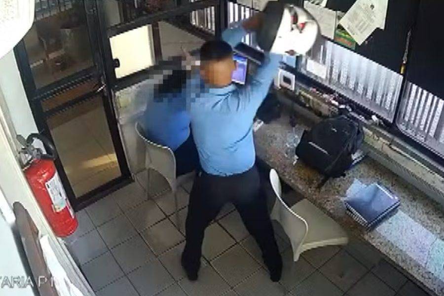 Nas imagens, é possível ver o momento em que os dois discutem dentro da portaria do condomínio. Durante o desentendimento, o agressor pegou um capacete e atingiu a cabeça da vítima várias vezes.