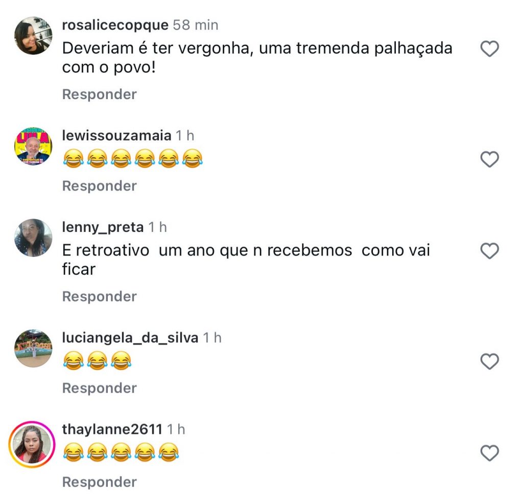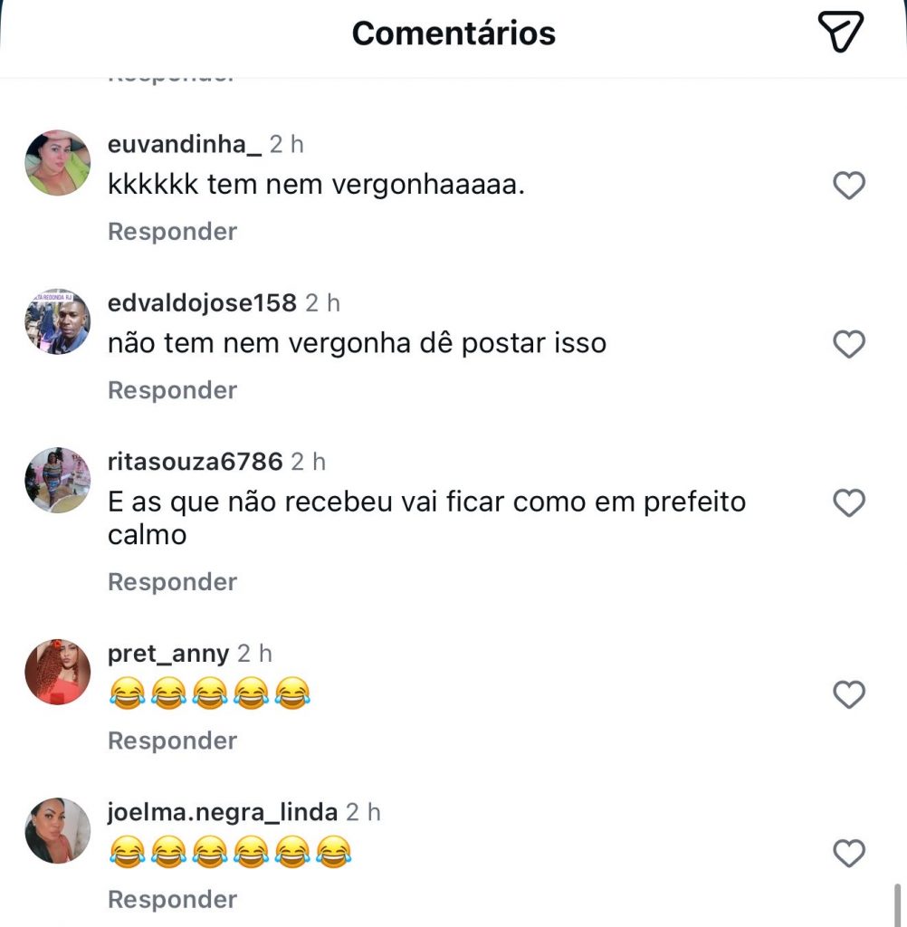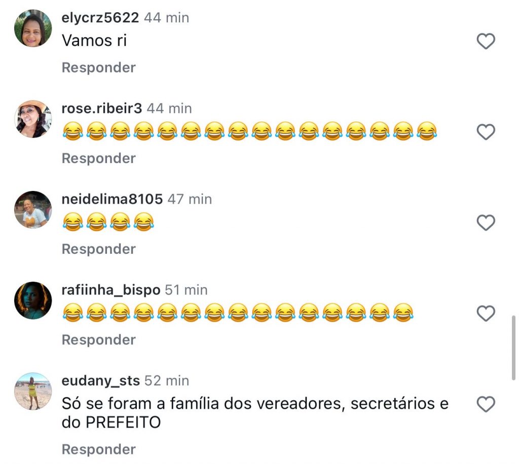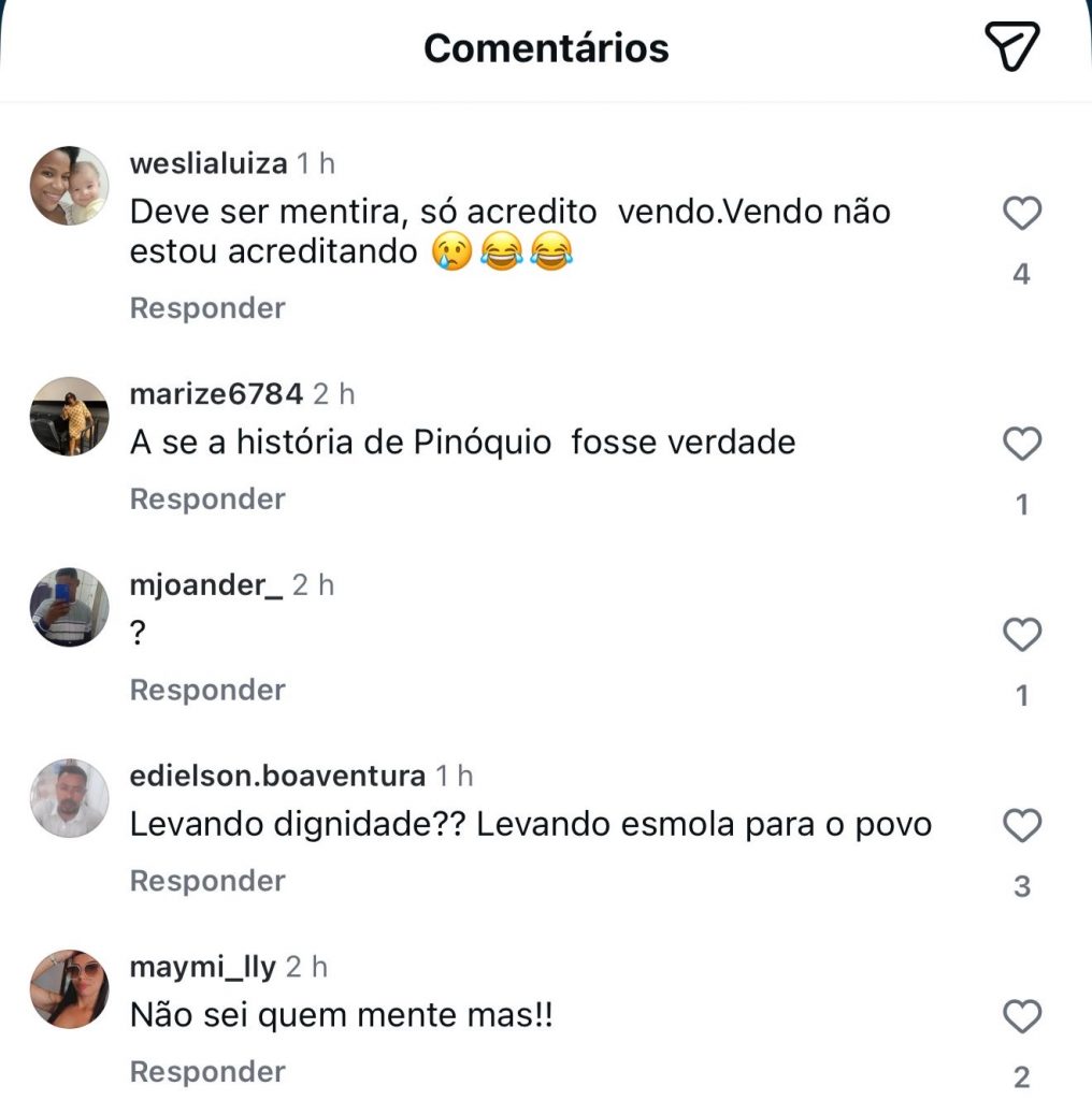 Nos comentários, a população expressou sua revolta sem rodeios: “Vocês não têm nem vergonha de postar isso”, escreveu um seguidor. Outra pessoa ironizou: “Que marmelada.” Houve quem duvidasse da veracidade da informação: “Só acredito vendo. Vendo não estou acreditando 🤣😂.” Vieram comparações: “A história de Pinóquio fosse verdade…” e “Tudo fantasma 😂😂😂.” Muitas famílias expuseram a realidade: “Hoje com isso tudo, na lista ficou menos de 1500 pessoas”, “Esse circo sem lona?”, “Vocês não têm vergonha de dizer que isso é o Pão na Mesa não”, “Você sobrevive com o valor que você pagou? Diz aí para o povo saber.” Outros resumiram: “Fake news temos 😂”, “Não sei quem mente mais”, “Tem nem vergonhaaaa”, “Essa gestão é vergonhosa, não tem um pingo de amor ao próximo”, “Só se foram a família dos vereadores, secretários e do prefeito”, “Nem é primeiro de abril, ai ai viu.”