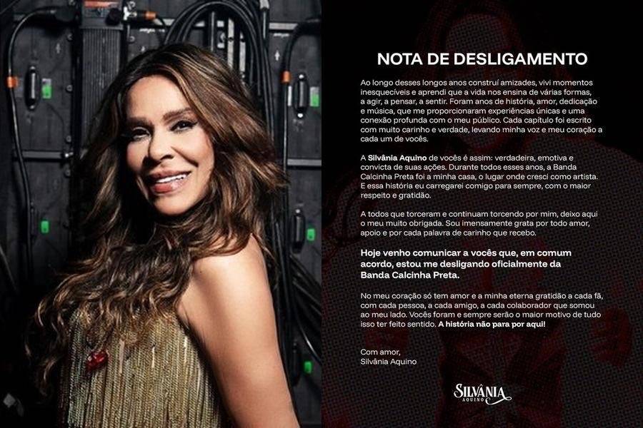 A cantora Silvânia Aquino anunciou, nesta segunda-feira (10), sua saída do Calcinha Preta após mais de duas décadas integrando uma das maiores bandas de forró do país. A novidade foi comunicada pela própria artista nas redes sociais, onde ela soma milhares de seguidores.