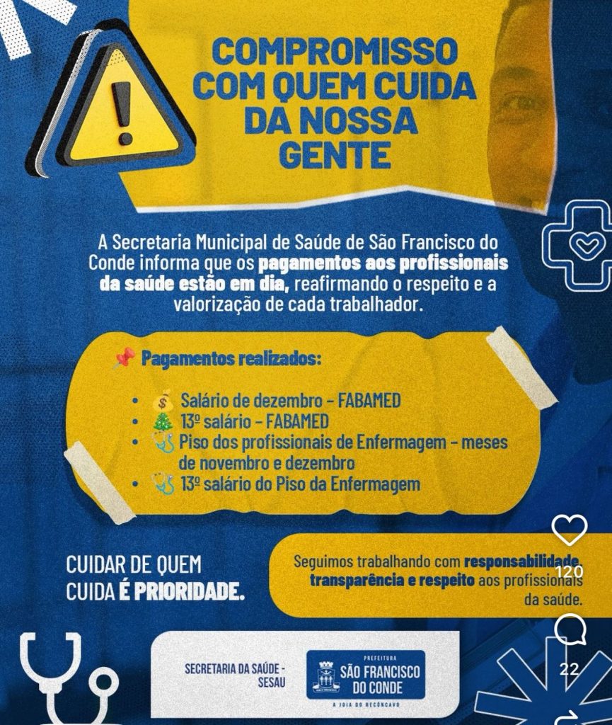 A publicação recente da Secretaria Municipal de Saúde de São Francisco do Conde, anunciando pagamentos “em dia” aos profissionais da área, provocou forte reação popular e reacendeu um debate que vem crescendo nos bastidores e nas redes sociais: a sensação de que existe hoje uma prefeitura dentro da própria prefeitura. O card oficial, com linguagem positiva e tom institucional, contrasta frontalmente com o cenário vivido por outras áreas da administração municipal, onde há relatos de atrasos salariais, benefícios suspensos, serviços paralisados e fornecedores sem receber.