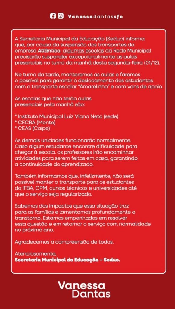 De acordo com o comunicado, assinado pela secretária Vanessa Dantas, as escolas Instituto Municipal Luiz Viana Neto, CECBA e CEAS não terão atividades no turno da manhã. A Seduc afirma que, no período da tarde, tentará manter as aulas utilizando o transporte “Amarelinho” e vans de apoio, embora reconheça que a capacidade é insuficiente diante da demanda de toda a rede.