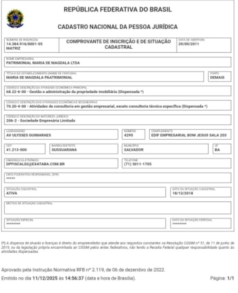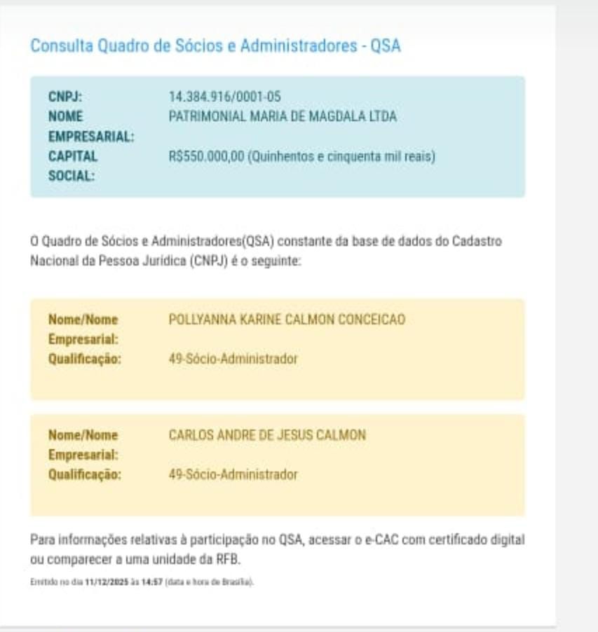 A crescente preocupação também recai sobre a empresa PATRIMONIAL MARIA DE MAGDALA LTDA, inscrita no CNPJ nº 14.384.916/0001-05, registrada em nome de Polyanna e Carlos André. A empresa, aberta em 29/08/2011, atua nos ramos de gestão e administração de propriedades imobiliárias e consultoria empresarial. O capital social declarado é de R$ 550 mil, com endereço na Avenida Ulysses Guimarães, nº 4295, sala 203, Edifício Empresarial Bom Jesus, bairro de Sussuarana, em Salvador.