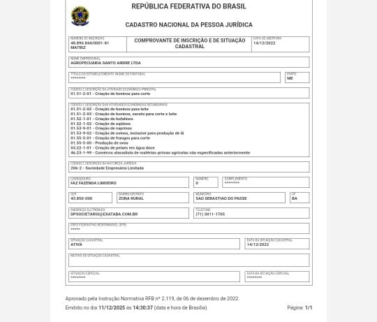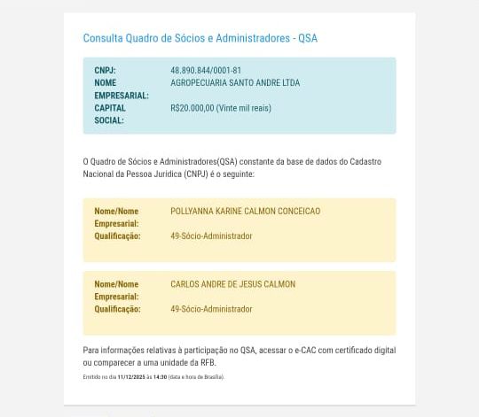 Documentos oficiais da Receita Federal mostram que os filhos do prefeito, Polyanna Karine Calmon Conceição e Carlos André de Jesus Calmon, são sócios-administradores da empresa Agropecuária Santo André LTDA, inscrita no CNPJ nº 48.890.844/0001-81. Apesar do capital social declarado de apenas R$ 20 mil, a estrutura e a movimentação patrimonial da fazenda chamam atenção por aparentarem valor muito superior ao inicial.